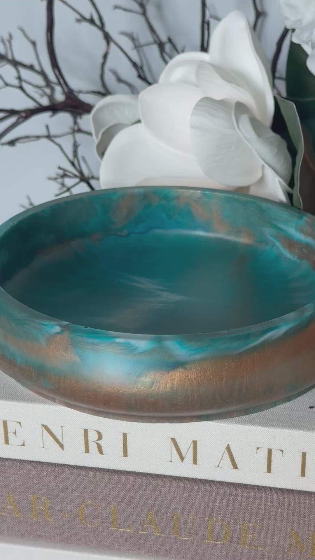 Luxe matte-finish bowl, hand-poured and inspired by natural Amazonite stone. Teal, turquoise, ivory, and Egyptian bronze accents for home decor. Bowl would be perfect for special vanity trinkets or to hold your keys in the foyer.