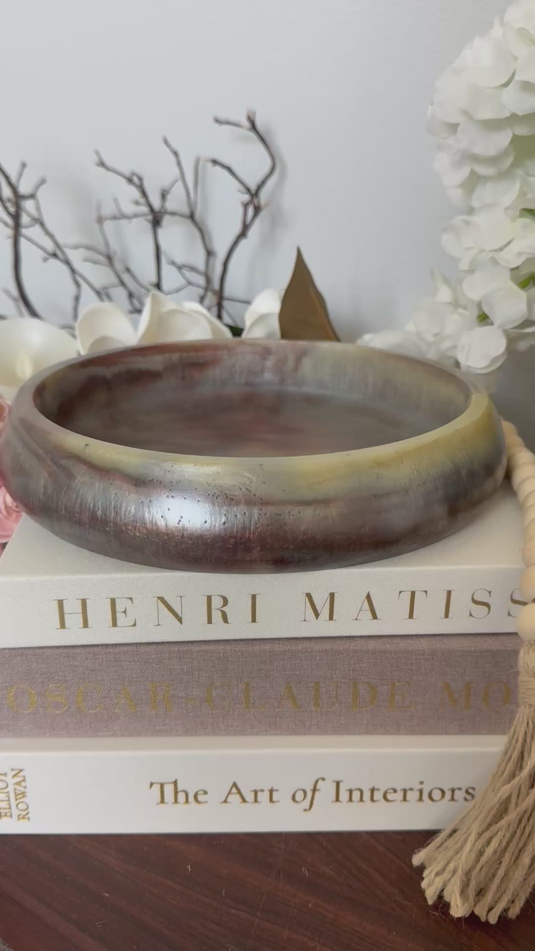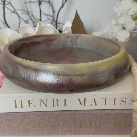 Inspired by the soft, organic elegance of natural brown garnet this handcrafted bowl captures the timeless look of stone—without the weight, porosity, or fragility of real stone or concrete. Each piece is individually poured and finished by hand, creating subtle variations that make every bowl one of a kind. This bowl is a delicate blending of muted dark garnet red and creamy tortoise shell creamy blended highlights. The diameter is 9” and 1.75” high.