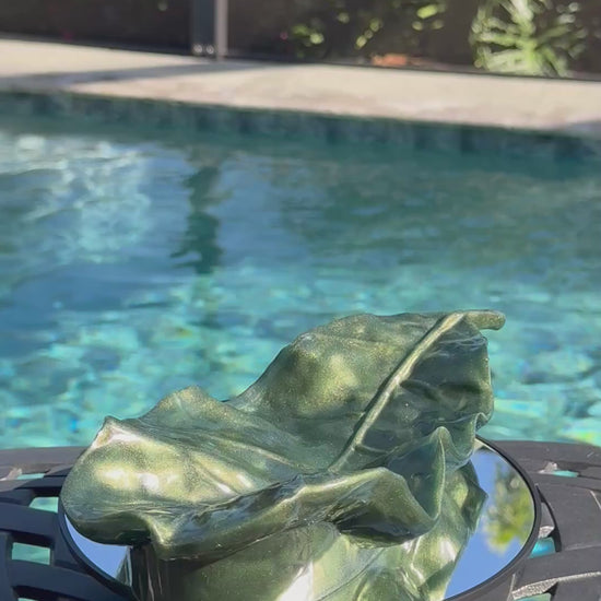 A smooth green blend evokes the timeless beauty of jade in this resin bowl. The piece is durable, lightweight, and ready to ship—combining elegance and practicality for modern homes. This dish is 12” long x 5” x2.5”. It weighs 1.2lbs.