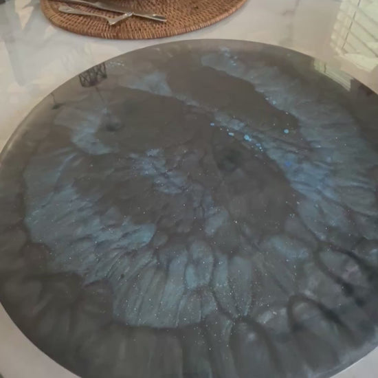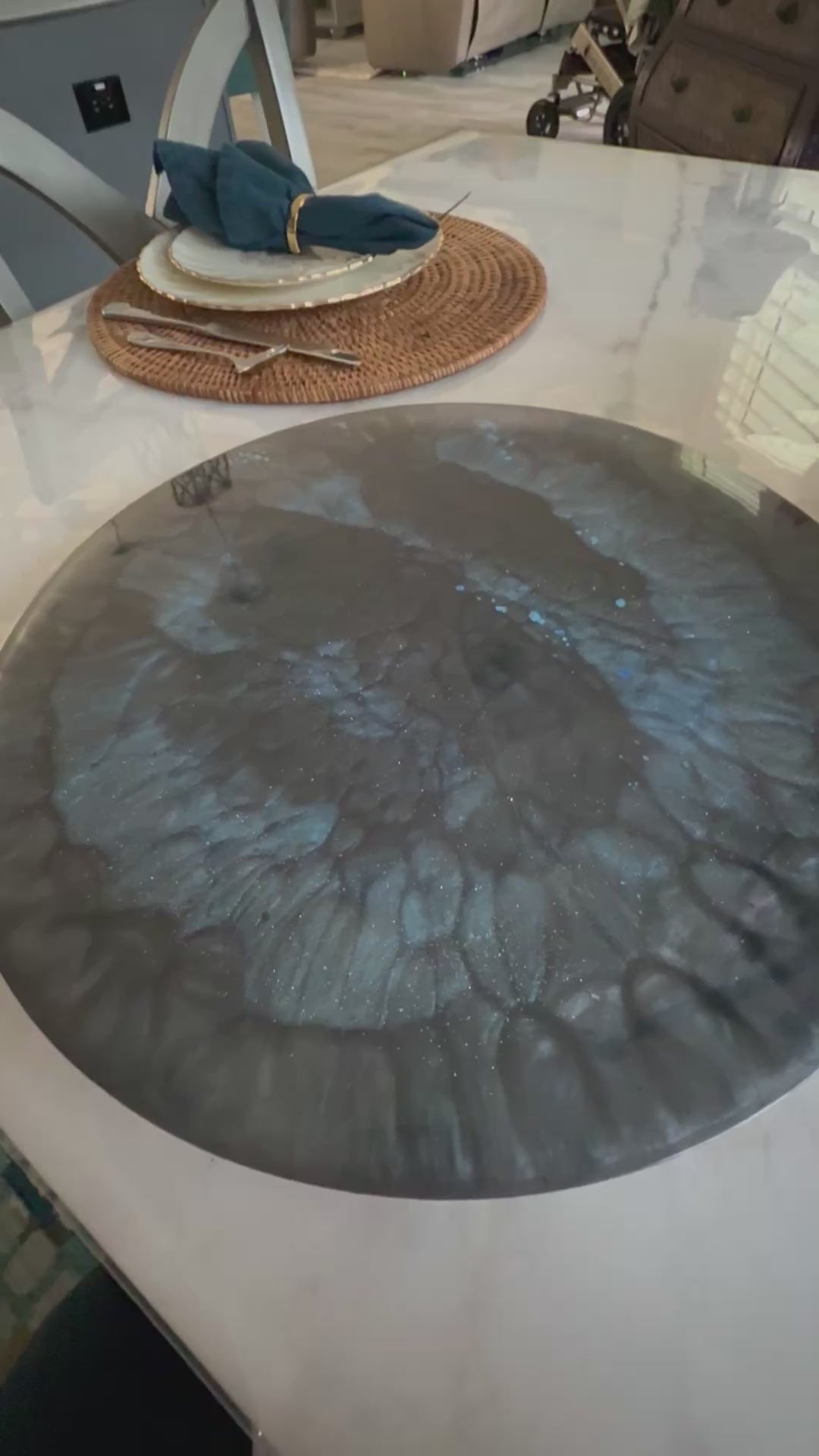 With iridescent flashes of blue, grey and black, this labradorite-inspired resin Lazy Susan captures the stone’s magical play of color. Lightweight, durable, and ready to ship—perfect as a striking home accent or functional serveware. The Lazy Susan is 15” in diameter and 3/4” thick. The 10” aluminum heavy duty bearing base does not hurt the integrity of the resin. It is a simple set up by placing the mechanism on the table and then placing the Lazy Susan on top for easy turning. No attachment involved. The rubber cushions on both sides keep the mechanism snug on your table and the underside of the Lazy Susan.