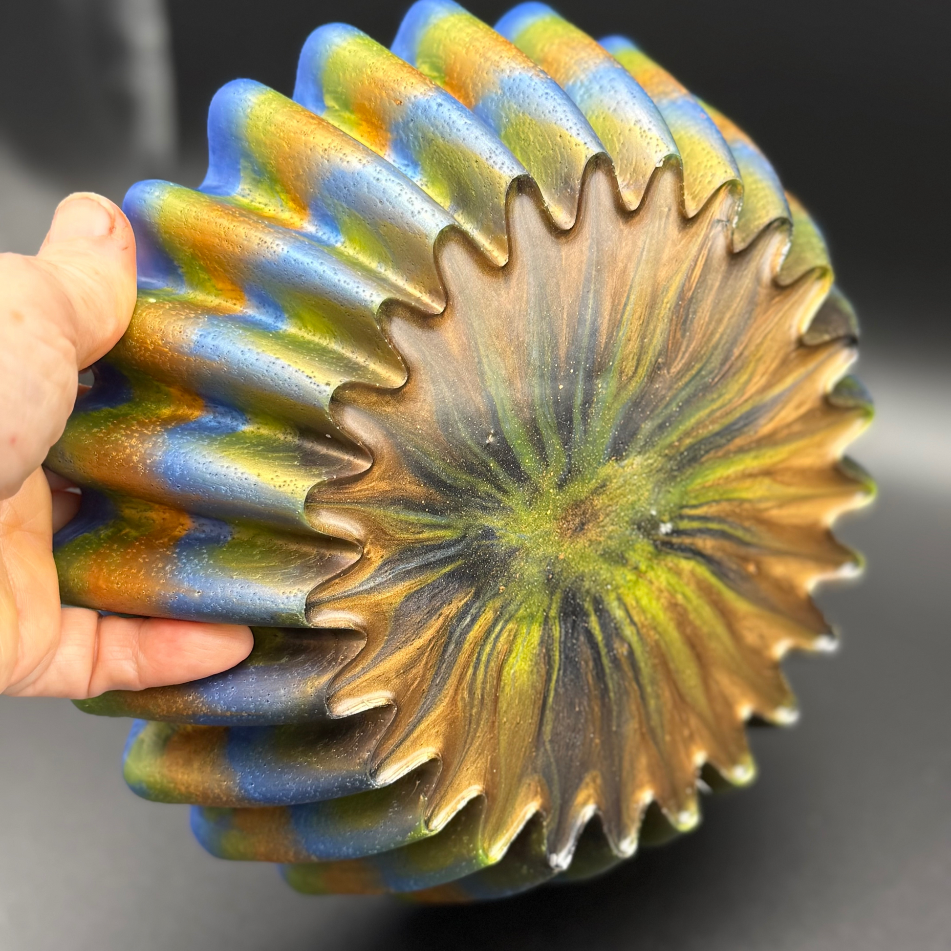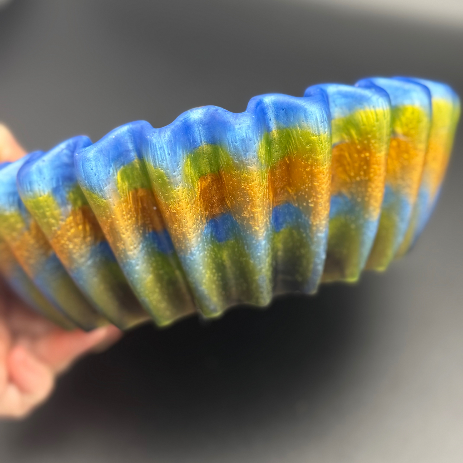 This Multi Mix Muse resin pleated bowl blends blues, greens, golds, bronze, and indigo hues into one organic masterpiece. Lightweight yet durable, it’s both functional and artful.
