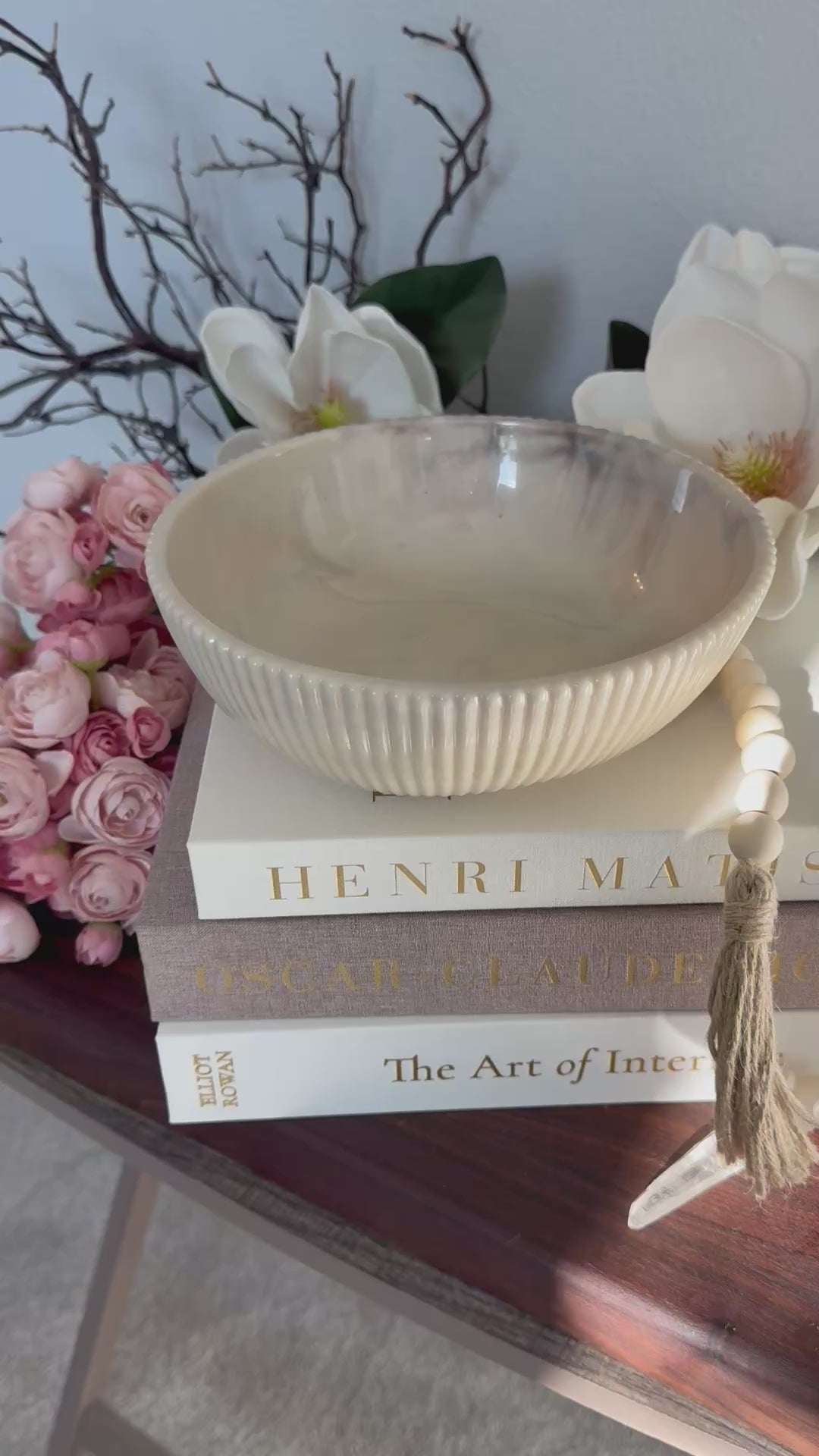 This alabaster-inspired resin bowl radiates soft, creamy translucence reminiscent of carved stone. Each piece is hand-poured with subtle marbling that captures the timeless elegance of alabaster while remaining feather-light and functional. Unlike real stone bowls that can be heavy and fragile, this resin design offers beauty with ease of use. The bowl is 7.75” in diameter and 2.5” in height. The weight is 13 oz.