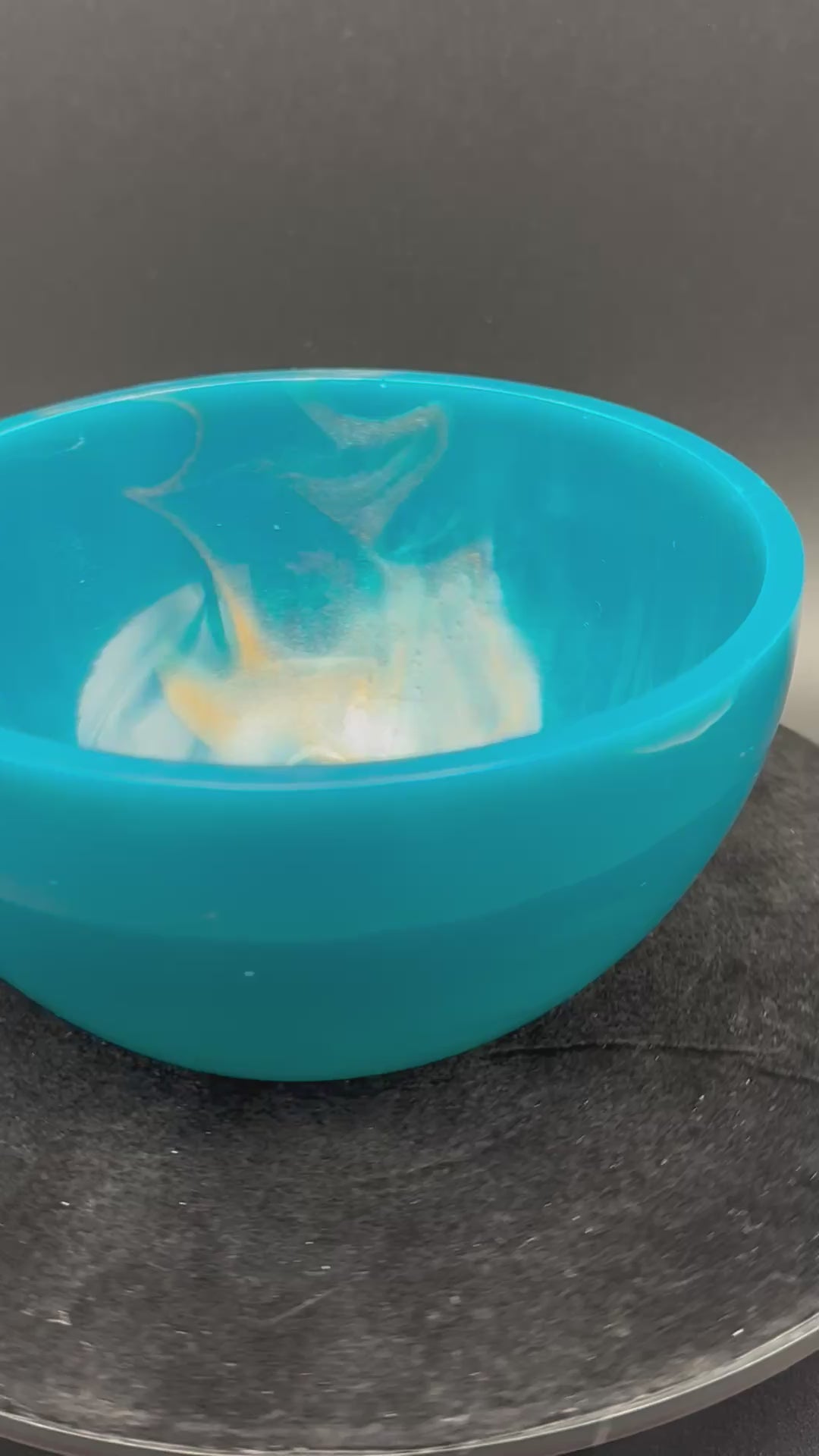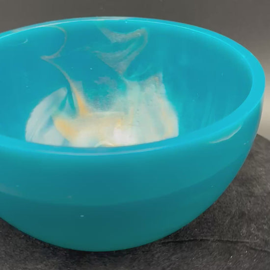 This Multi Mix Muse resin bowl blend teal and gold hues into one organic masterpiece. Lightweight yet durable, it’s both functional and artful. The bowl is 5” in diameter (small) x 2.75” in height. It weighs 6oz.